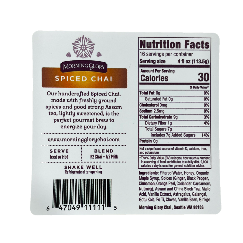 Ingredients: Filtered Water, Honey, Organic Maple Syrup, Spices (Ginger, Black Pepper, Cinnamon, Orange Peel, Coriander, Cardamom, Nutmeg), Assam Black Tea, China Black Tea, Malic Acid, Vanilla Extract, Astragalus, Galangal, Gotu Kola, Fo Ti, Cloves, Vanilla Bean and Ginkgo.